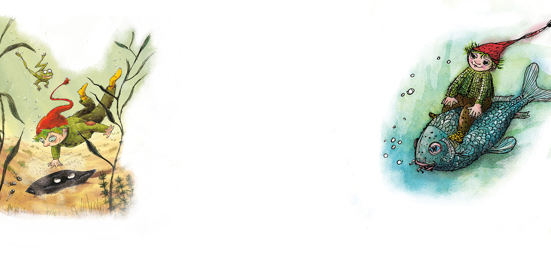 Mit dem kleinen Wassermann ist jeder Tag voller neuer Abenteuer! Mit seinen grünen Haaren, den Hosen aus Fischschuppen und der roten Zipfelmütze ist er überall zu erkennen, er erkundet die Welt außerhalb des Weihers und schließt allerlei Freundschaften, bis es Winter wird. Dann bereitet er sich wie alle Wassermänner auf den langen Winterschlaf vor …