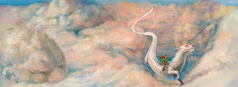 • Gemalte Szene aus der Schmuckausgabe: Eine Figur in rotem Umhang reitet auf einem weißen Drachen mit roten Augen durch eine mystische, wolkenartige Landschaft.