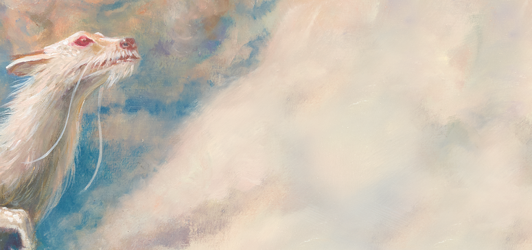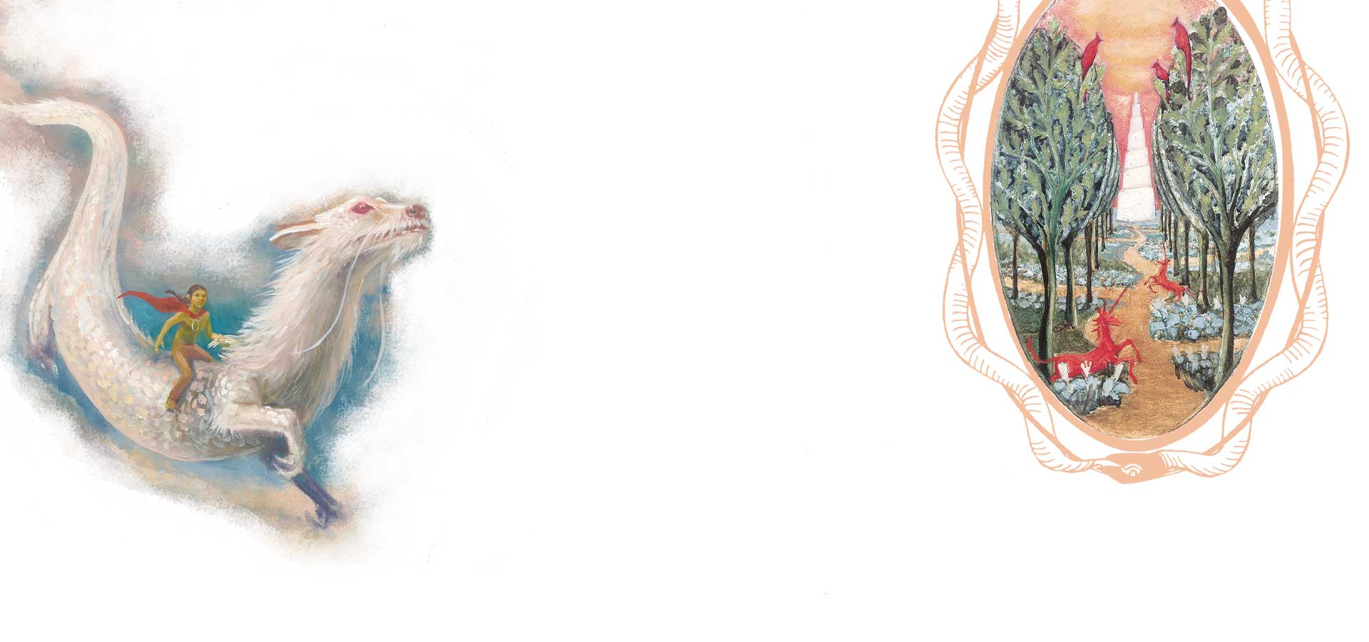 Gemalte Szene aus der Schmuckausgabe: Eine Figur in rotem Umhang reitet auf einem weißen Drachen mit roten Augen durch eine mystische, wolkenartige Landschaft.